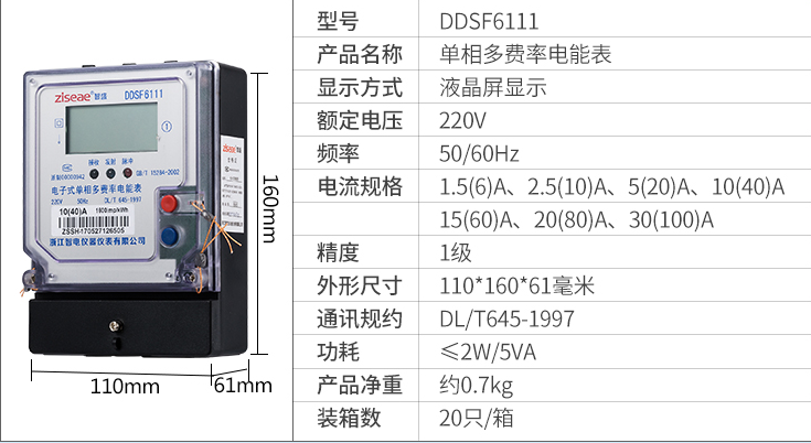 DDSF6111單相電子式多費率電能表,采用單片機處理系統(tǒng)設計而成,具有電路簡單、可靠性高、成本低等優(yōu)點。該產(chǎn)品軟件、硬件、結構設計技術先進,計量精度高,結合單片機資源,實現(xiàn)電能分時計量,具有紅外及RS-485通信功能,抗干擾、防攻擊性能好,工作溫度范圍寬,能長期穩(wěn)定可靠工作。該產(chǎn)品各項性能指標符合國家GB/T 17215-2002《1級和2級靜止式交流有功電能表》、GB/T 15284-2002《復費率(分時)電能表特殊要求》、DL/T 645-1997《多功能電能表通信規(guī)約》等標準的技術要求。